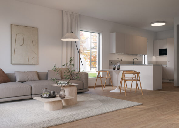 Asuntojen suunnittelussa on painotettu arjen sujuvuutta ja tilojen käytännöllisyyttä. Avarat oleskelutilat avautuvat suurin ikkunoin omalle pihalle ja terassille, mikä tuo runsaasti luonnonvaloa ja lisää yhteyttä ulkotilaan.